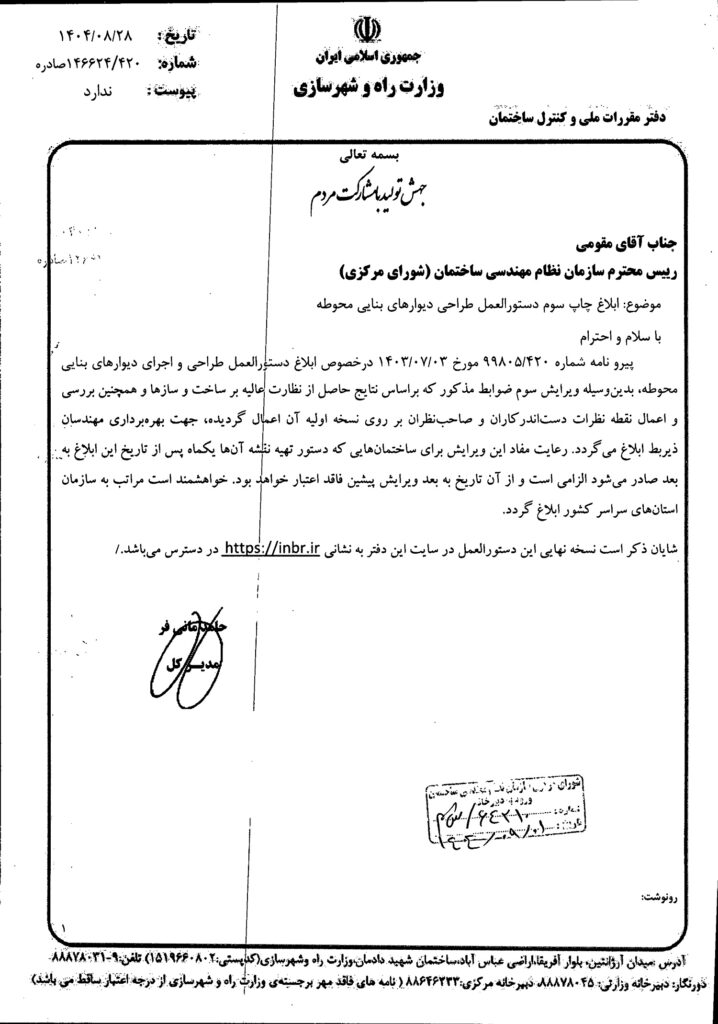 ابلاغ چاپ سوم دستورالعمل طراحی دیوارهای بنایی محوطه