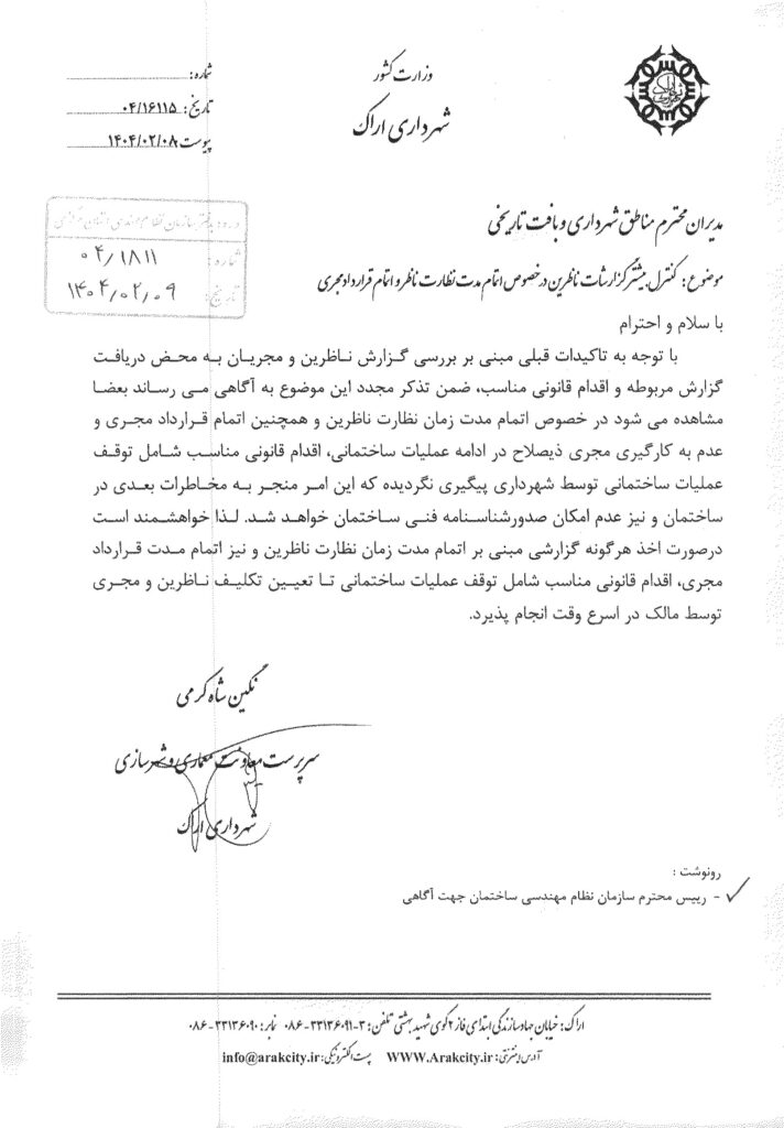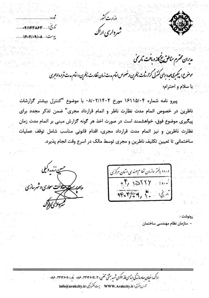 پیگیری مجدد برای کنترل گزارشات ناظرین در خصوص اتمام مدت زمان نظارت ناظرین و اتمام مدت قرارداد مجری