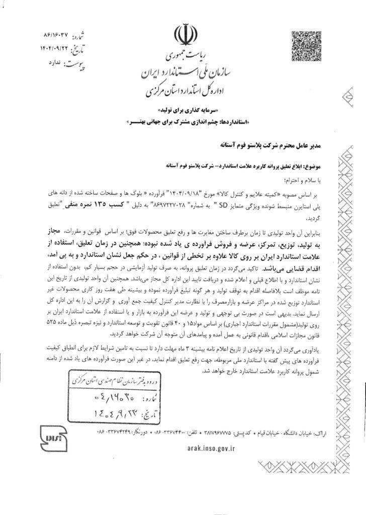 نامه ابلاغ تعلیق پروانه کاربرد علامت استاندارد-شرکت پلاستو فوم آستانه