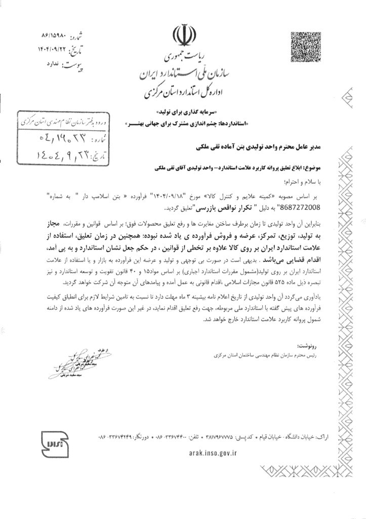 - ابلاغ تعلیق پروانه کاربرد علامت استاندارد-واحد تولیدی آقای تقی ملکی