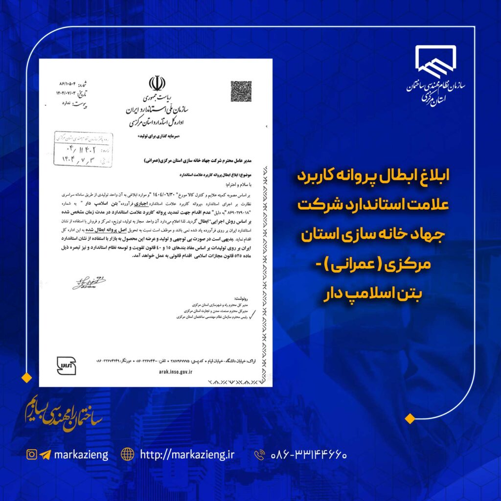 ابلاغ ابطال پروانه کاربرد علامت استاندارد شرکت جهاد خانه سازی استان مرکزی ( عمرانی ) – بتن اسلامپ دار