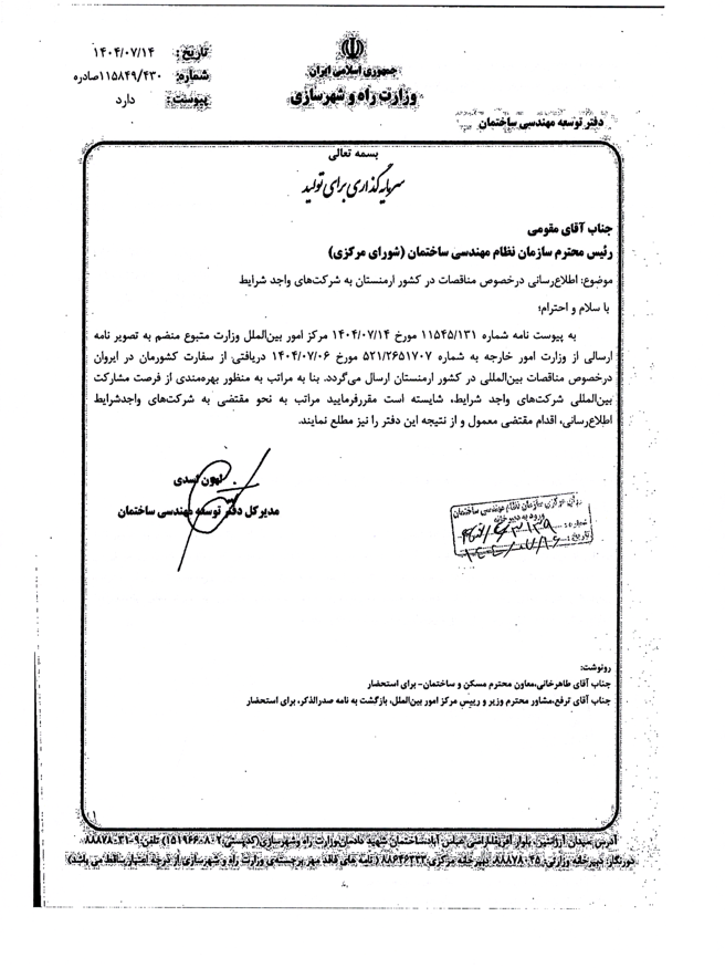 - افراد و شرکت های توانمند جهت مشارکت در مناقصه کشور ارمنستان